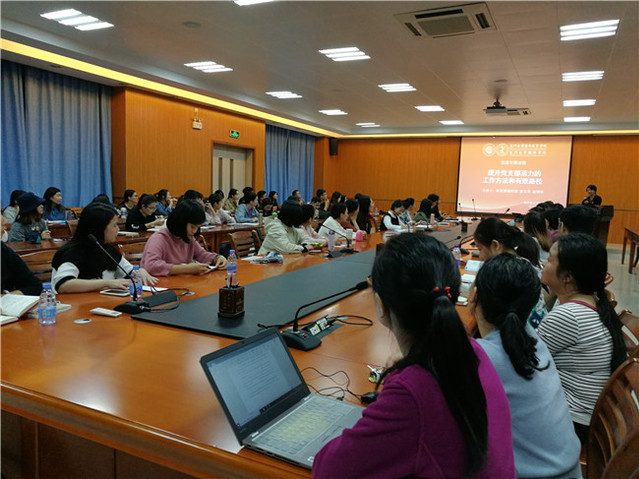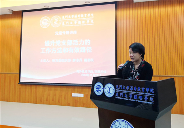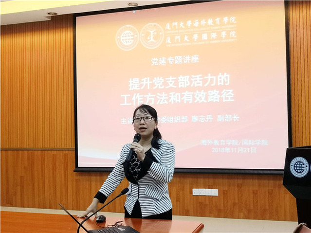11月21日晚7时,校党委组织部副部长廖志丹老师应邀来到海外教育学院/国际学院C104会议室,在学院党委二级党校作了题为《提升党支部活力的工作方法和有效路径》的党建专题讲座。讲座由学院党委书记王艺主持,学院教工党支部委员和全体学生党员出席了讲座。