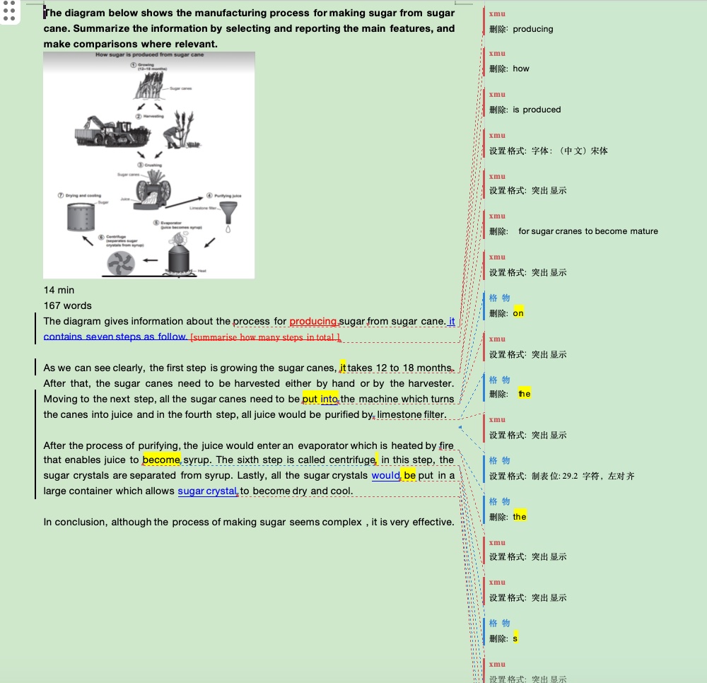我每天至少写一篇大作文和一篇小作文,并要求自己一定在规定时间内完成。一般首篇限时15分钟,次篇限时20分钟。写完作文之后剩下的时间,我就通篇检查,校证语法错误。在备考阶段,我请李莉老师为我检查作业中的错误。每次她都会很认真地纠正我在语法方面存在的疏漏,并告诉我一些更好的表达方式。事实上,只要我们积极主动地向学院老师们请教,她们都会不遗余力地用心协助我们,不断提升英文水平与应试能力。