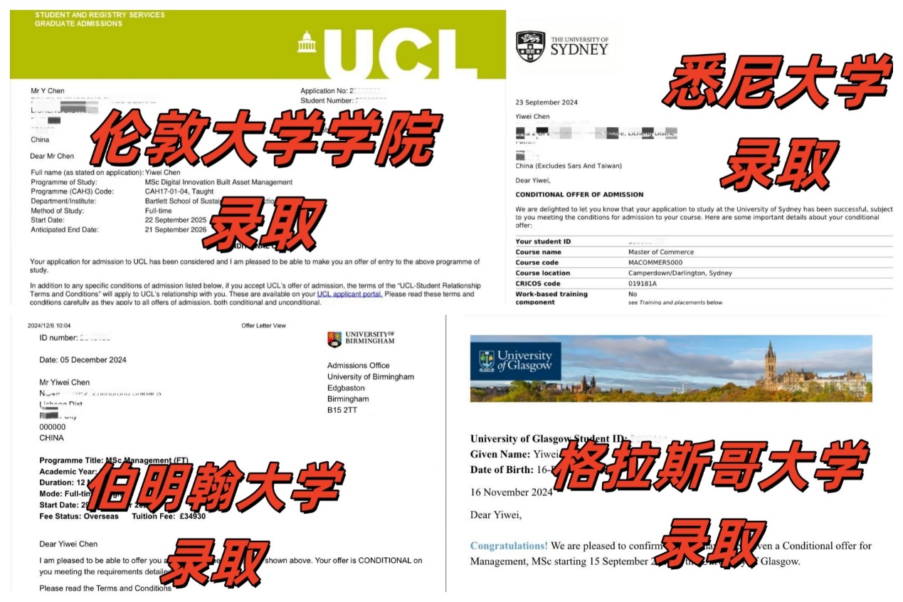 硕士阶段:已获得伦敦大学学院、悉尼大学、格拉斯哥大学、伯明翰大学等世界顶尖名校录取通知书