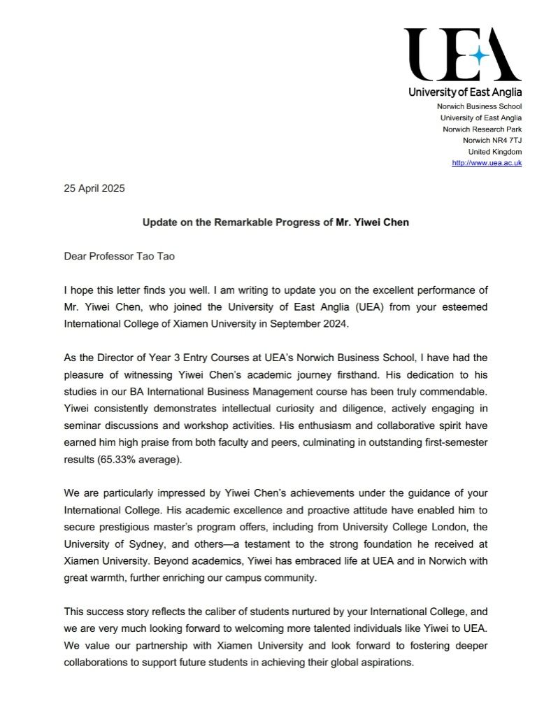 在信函中,东安格利亚大学诺里奇商学院课程主任更是将陈倚伟的成功视为两校合作的典范:“他的优秀学业和积极态度,证明了乐鱼网页版登录入口打下的坚实基础。我们期待更多像他这样的优秀学子加入UEA,共同续写两校合作的佳话。”字里行间,既是对学生个人的褒奖,更是对“百年名校 留学首选”厦门大学国际学院的高度认可。
