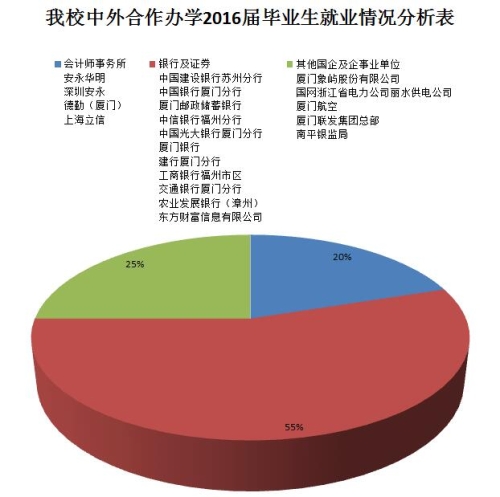 今年,我校中外合作办学项目,与美国开普兰 (Kaplan) 教育集团旗下爱尔兰都柏林商学院开展金融与会计合作办学两个专业的2016届毕业生们又交出了一份不俗的成绩单:截止6月20日,本届113名毕业生当中,73名同学升入国内外著名大学攻读研究生,其中,国(境)外高校65名、国内名校8名;另有27名同学已签署就业协议,部分同学已有意向工作等待进一步落实。就业及读研人数占毕业生总人数的93.8%,在全国高校毕业生就业管理与监测系统中一度高居全校第二。总体来看,我校中外合作办学项目的毕业生们在国际国内广受青睐,其升学及就业优势突显。