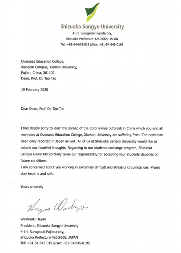 新春伊始,正值中国人民全力抗击新型冠状病毒肺炎疫情。在疫情阴霾的笼罩下,牵动着每位国人的心,然而患难见真情,大爱无国界,也牵动着各国友人的心。2020年2月20日,厦门大学海外教育学院/国际学院合作院校—日本静冈产业大学校长Washizaki Hayao 教授就中国新型冠状病毒肺炎疫情,向我院的陶涛院长发来邮件慰问与支持,他谨代表静冈产业大学的全体员工向全院师生致以最诚挚的祝福,承诺会以更坚强的决心、更深沉的敬意同中国师生们同心抗疫,共克时艰。Washizaki Hayao 教授说:“得知您和厦门大学海外教育学院/国际学院的全体师生在中国遭受冠状病毒疫情的传播,我深感遗憾。日本每天都会报道相关疫情的新闻。所有在静冈产业大学的工作人员都想表达我们衷心的想法。对于两校之间的学生交换计划,静冈产业大学将根据未来情况承担接收学生的责任。我十分担心您在极其困难和紧张的情况下工作,请保持健康和安全。”