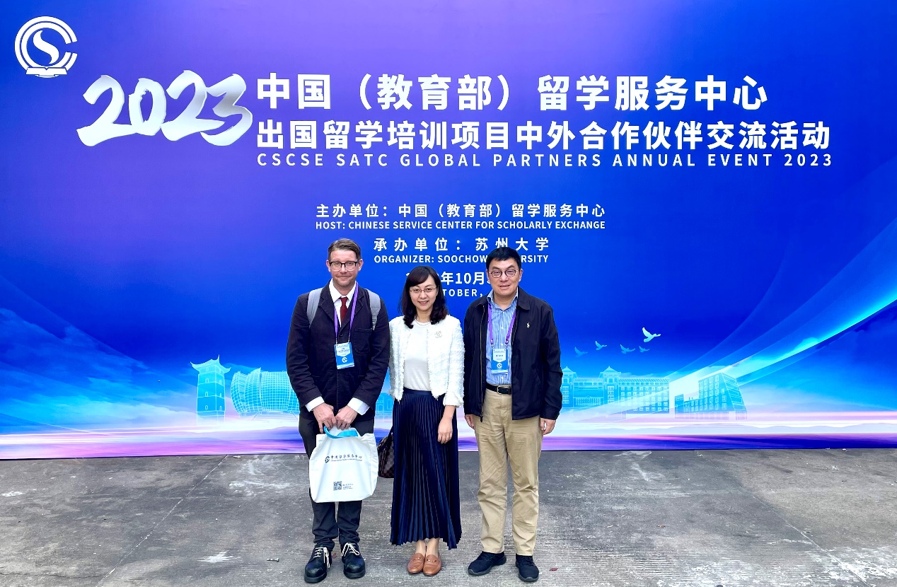 为推进中外高校间的交流与合作,促进出国留学项目高质量发展,10月30日,中国(教育部)留学服务中心在苏州大学举办2023出国留学培训项目中外合作伙伴交流活动。来自国内55所国内院校和38所海外院校的200余位代表参加活动。作为国内院校代表,国际学院院长陶涛教授、党委副书记马向华、日语教研组组长闫飒和项目协调员陈健茹一行四人前往苏州大学参加活动。