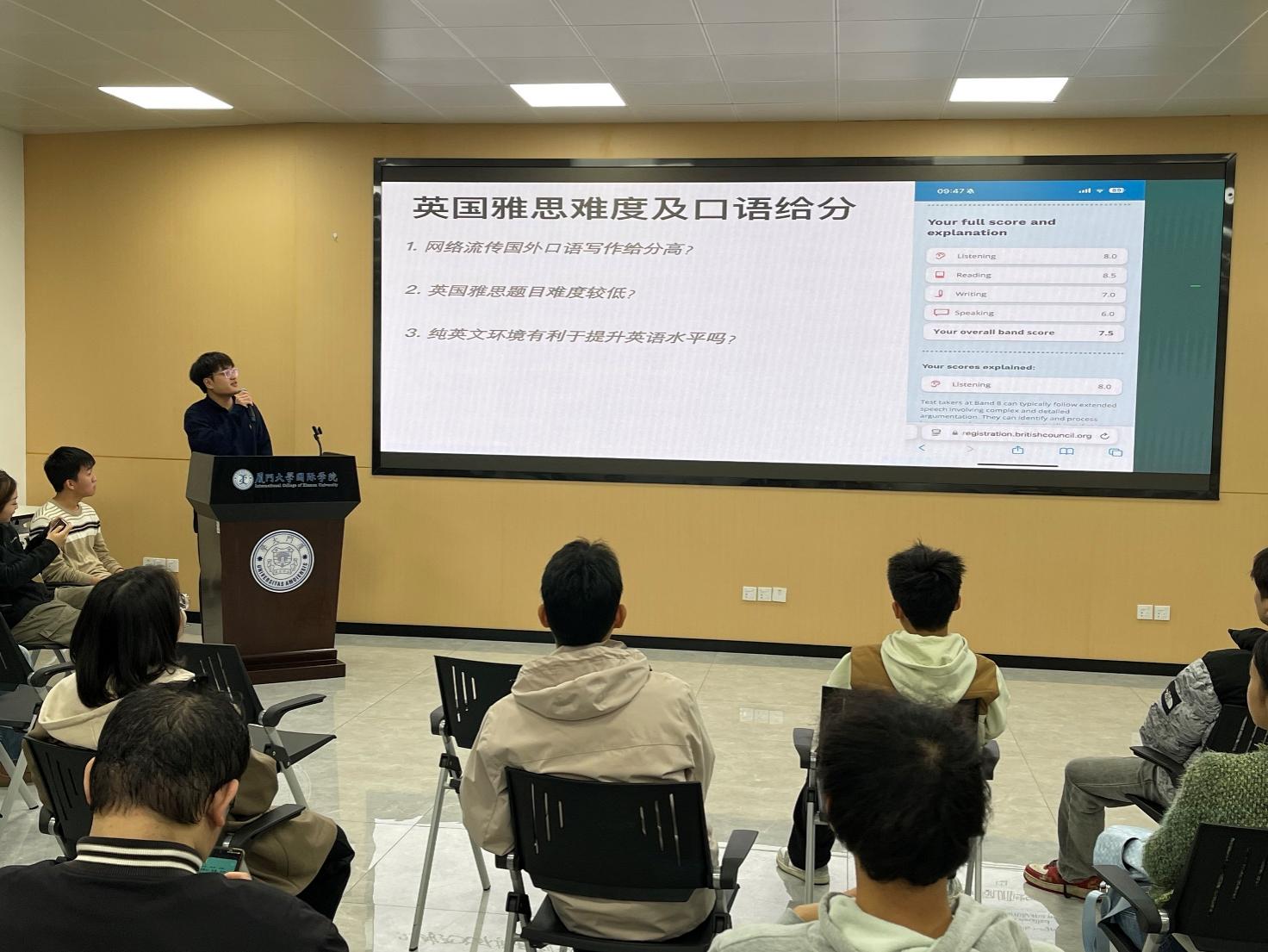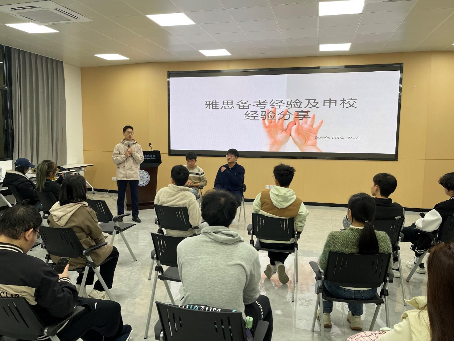 12月25日晚,一场别开生面的分享会在国际学院学生社区多功能厅101会议室举行。本次活动依托学生发展中心生涯发展与规划部组织开展,以“与‘雅’偕行,‘留’梦启航”为主题,旨在通过高分考生分享个人经历和经验,为正在“鏖战”雅思考试、未来出国升学的同学,提供实用的雅思高分备考经验和留学规划参考。