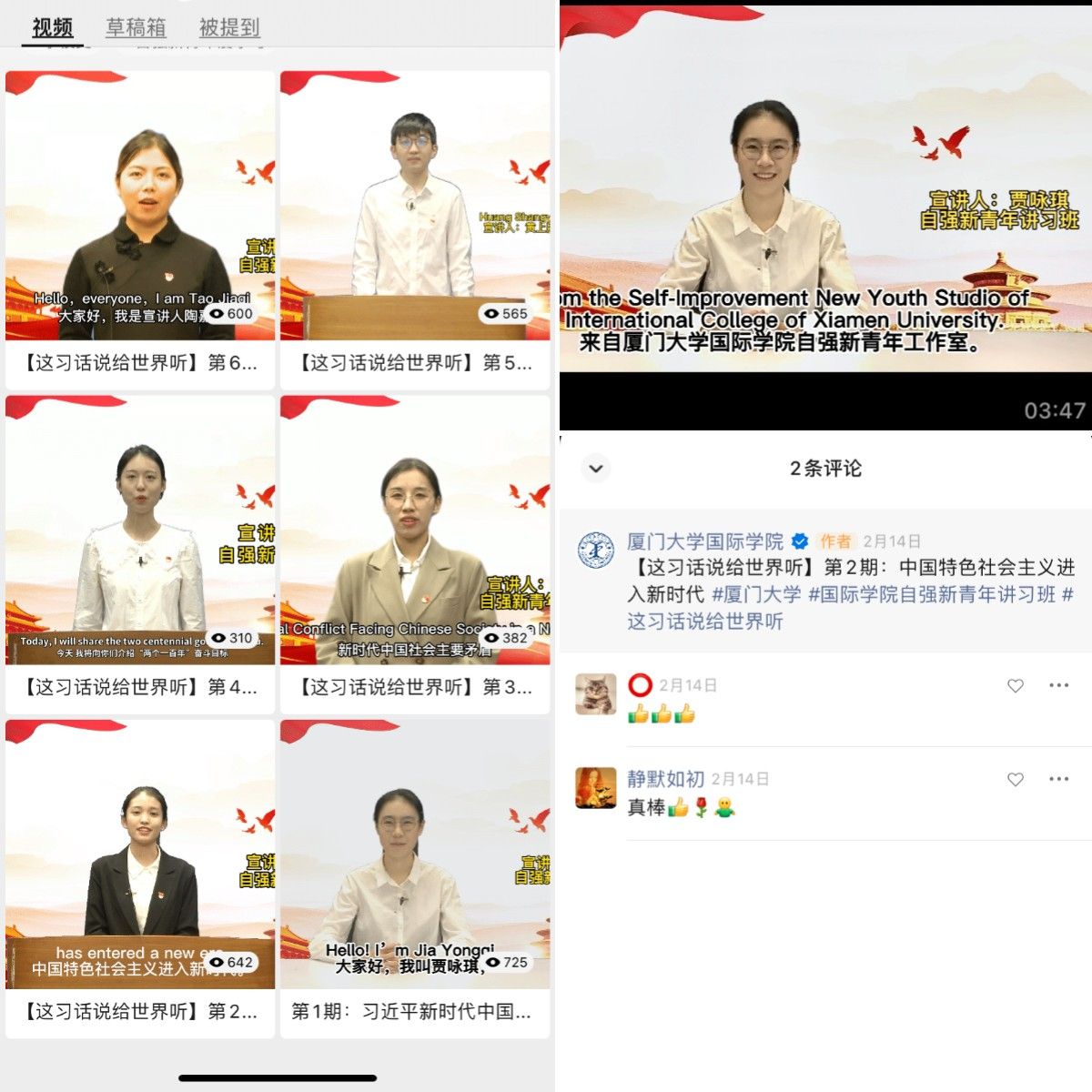 习近平总书记在贺信中,指出厦门大学是一所具有光荣传统的大学。100年来,学校秉持爱国华侨领袖陈嘉庚先生的立校志向,形成了“爱国、革命、自强、科学”的优良校风。一年来,为持续深入弘扬四种优良校风,国际学院立足师生专业优势,推出“自强新青年”学校史栏目,组织青年学子深入挖掘校内红色资源,赓续百年厦大的红色精神血脉,用英文讲述陈嘉庚先生爱国兴学、罗扬才烈士投身革命、厦门大学自强不息西迁办学、校长王亚南矢志翻译《资本论》、陈景润先生勇攀科学高峰、高捷成首创红军会计工作制度等故事。6期宣讲微视频一经国际学院视频号发布,便在师生中广泛传播,浏览量达4.6万余次,其中,《红色金融家——厦大1927级校友高捷成》宣讲微视频更是获得了高捷成后人的点赞肯定,极大激发了全院师生的爱国之情、报国之志,极大增强了作为厦大人的自豪感、使命感和责任感,为学校国际化办学、一流大学建设贡献青春力量。