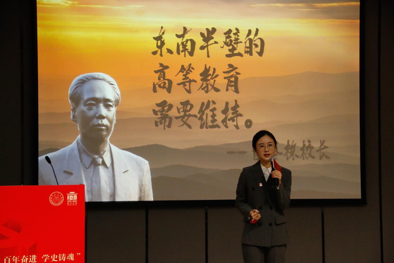 徐瑜婕同学以《漫漫长汀路,烽火映南强》为题,围绕抗战时期厦大西迁长汀——自强不息,南方之强的主题,讲述了当时厦大人面对重重困难,如何以自己平凡渺小的力量,经过夜以继日的不懈奋斗,支撑起战乱时代民族脊梁的故事,让我们深刻感悟到了厦大西迁长汀临危不惧、艰苦卓绝的自强精神。