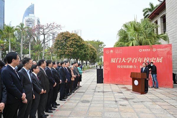 3月7日上午,厦门大学百年校史展开展仪式在群贤楼前举行。校党委书记张彦宣布百年校史展开展。原校党委书记王豪杰,原校长、厦门大学校友总会理事长朱崇实,厦门大唐房地产副董事长、陈章辉福信慈善基金会理事长唐国钟等出席。