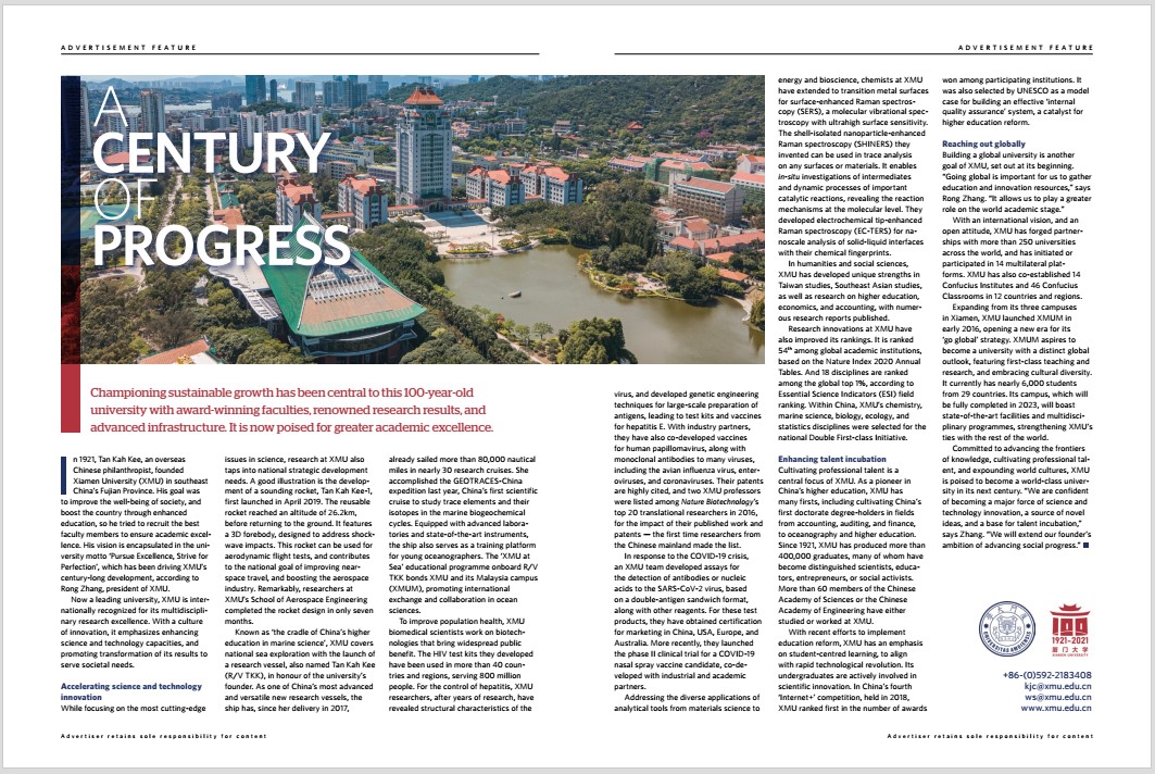 作为特刊的重要内容之一,厦门大学校长张荣的专题访谈以“A history of Discovery Expands Into The Future(承百年辉煌,迎创新未来)”为题,从“学校独特的文化特质、如何推动科技创新能力的提升、如何促进师资队伍的引进和培养、如何进行人才培养、如何加强国际交流与合作、厦门大学马来西亚分校的建设进展等六个方面,向Nature全球读者介绍了学校在百年办学历程中的治校理念、发展成就和前景蓝图。