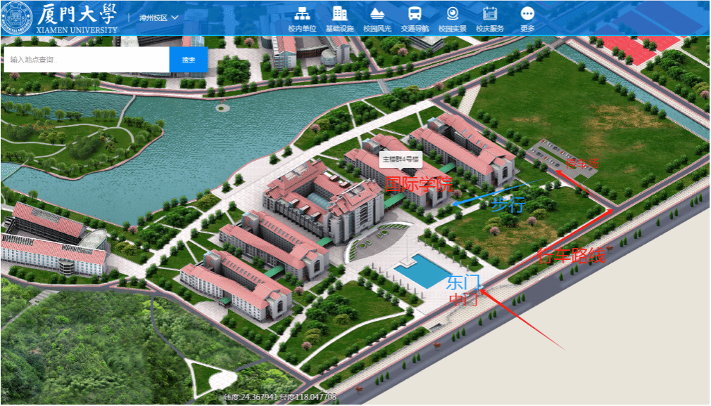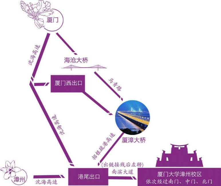 厦门大学漳州校区位于厦门湾南岸的漳州招商局经济技术开发区,与思明校区隔海相望。如自驾抵达校区的来宾请导航至“厦门大学漳州校区东门”,驾驶车辆需与入校预约中提交的车辆一致。