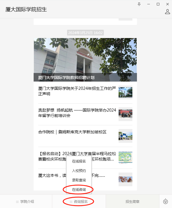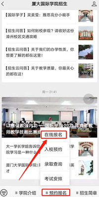 关注公众号“厦大国际学院招生”——点击“预约报名”——“在线报名”