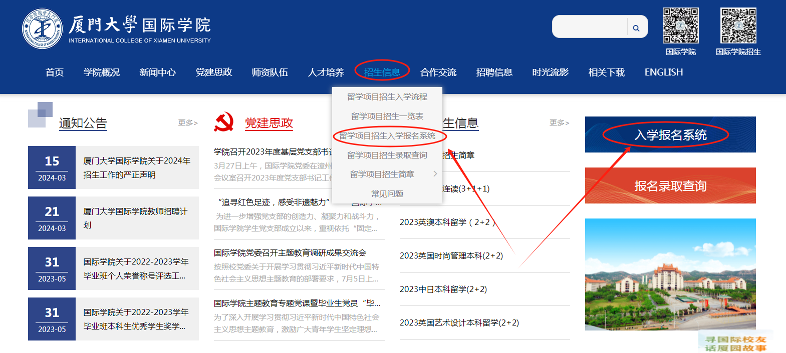 登陆学院官方网站www.wmdbook.com ,点击右侧“入学报名系统”进行报名,或直接登陆招生报名系统http://gjzs.xmu.edu.cn进行报名